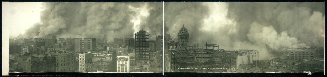 I am now writing, 8 p.m., by the light of the conflagration, in a kind lady’s house, on the hill side; the whole burning city is plainly visible from my window. The fire has spread from right to left and 300,000 people will be without shelter when the fire has exhausted itself. The women and children are asleep on the floor, and this is my watch. Where will these people of Frisco, so generous, when misfortune befalls others, get succor? This is surely a visitation from hell! Dante’s Inferno but feebly describes the horrors which are witnessed on every hand.