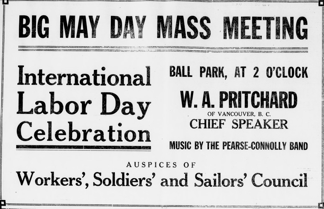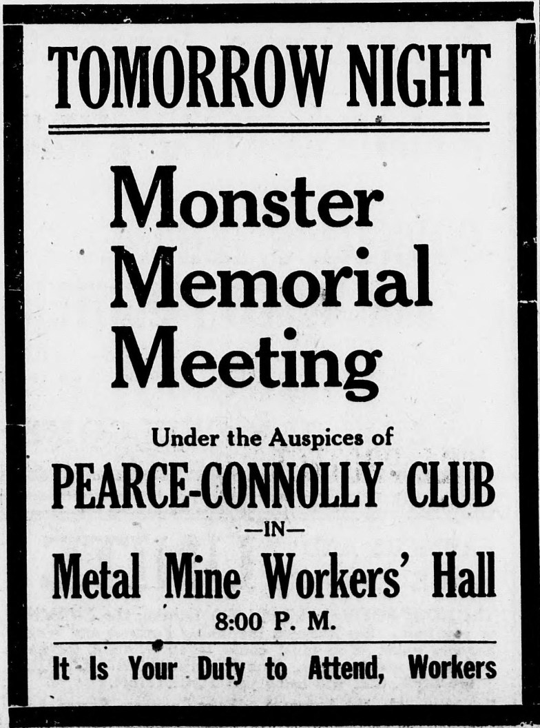 The Irish Workers Republic in the Montana mountains. The radical Irish working class of of Butte, Montana created a Pearse-Connolly Club to organize activities in 1919, the first year of the Irish War of Independence. Named after two leading martyrs of the 1916 Rebellion, Connolly himself a well-known figure among the U.S. left, the Club hosted meetings, held memorials, lectures, parades, acted as escort for De Valera on his visit to Butte, refused to march with Hibernians, provided music for May Day, buried their comrades, and much more. Here are a selection of their activities in 1919 from the Butte Daily Bulletin, edited by Irish-American radical William F. Dunne.