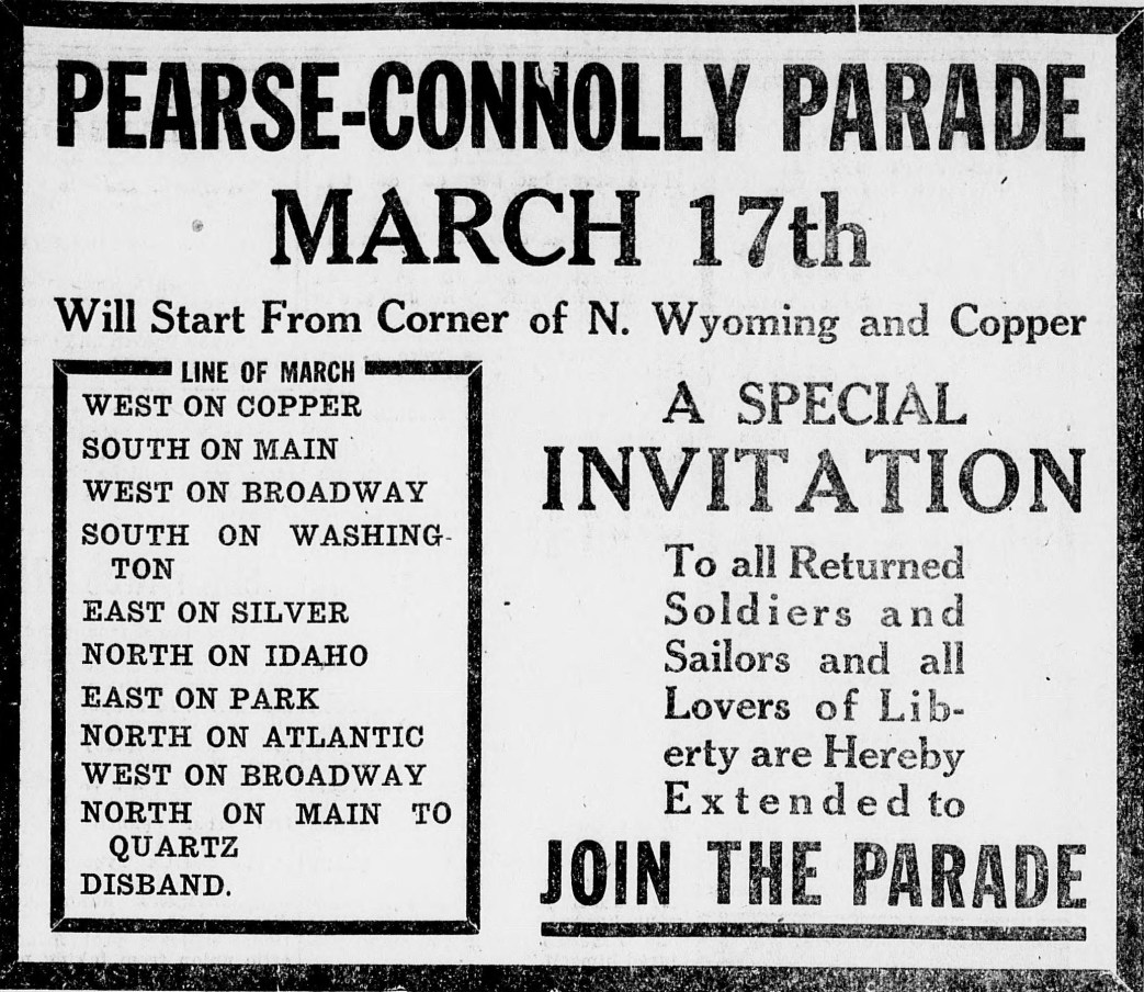 It will be a tribute to the gallant men of Dublin who lost their lives Easter week, 1916. The parade, which will be the first observance of the day, will form at the corner of Copper and Wyoming streets at 2 p.m. sharp, and will traverse all the prominent streets of the city.