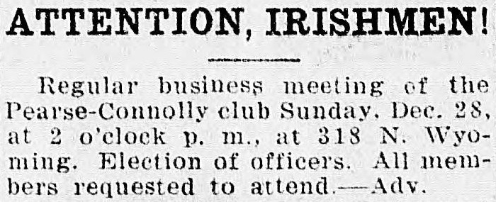 The Pearse-Connolly club will meet at their hall, 318 North Wyoming street, at 8 o’clock, Friday morning, sharp, for the purpose of escorting President De Valera of the Irish republic up town. All members of the band take notice and report to Con Bonuoe, treasurer, and all members please bring their sashes.