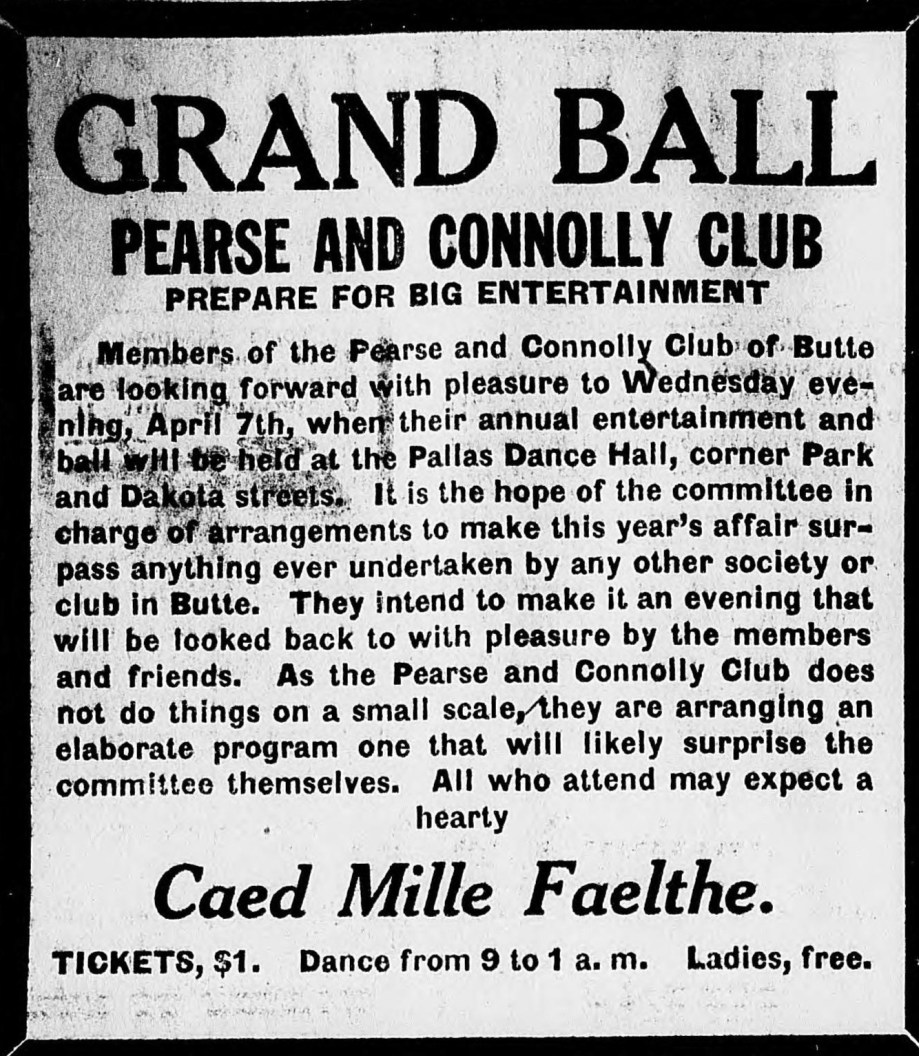 The largest and most enthusiastic Irish celebration held in Butte for years, putting in the shade the St. Patrick’s day demonstration, will be concluded by two big dances given tonight under the auspices of the Pearse-Connolly club at Pallment hall, South Montana street, and the Finnish Workers’ hall on North Wyoming street.