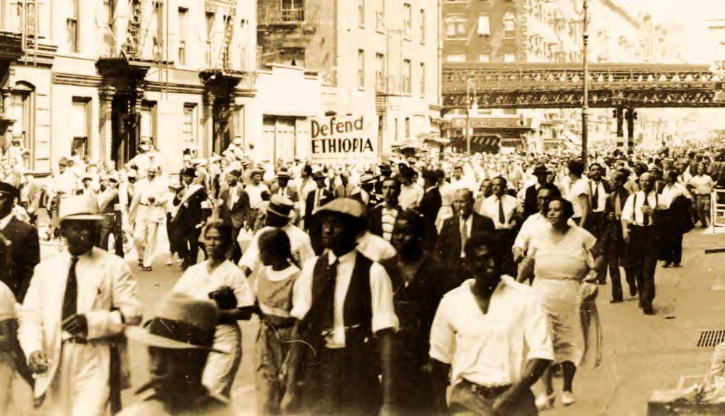 Italian workers are conspicuous in their presence denouncing the invasion of Ethiopia as tens of thousands protest in Harlem.