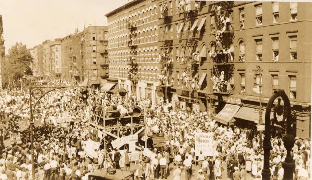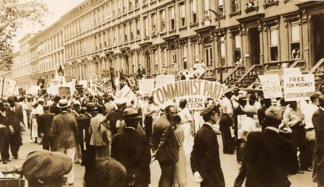 At 129th Street and Seventh Avenue, it was joined by the second contingent, which had assembled at 120th Street and Second Avenue and paraded through the Italian section before turning west. The united parade then swept up Seventh Avenue, and through 143rd Street to the square at 141st Street and Edgecombe and Bradhurst Avenues. As the head of the parade entered the square, it was greeted with cheers from several hundred workers who had already assembled around a huge platform erected for the occasion and equipped with loud speakers. Negro workers crowded the windows of the houses adjoining the square and in many instances served iced water to the thirsty marchers from ground floor apartments.
