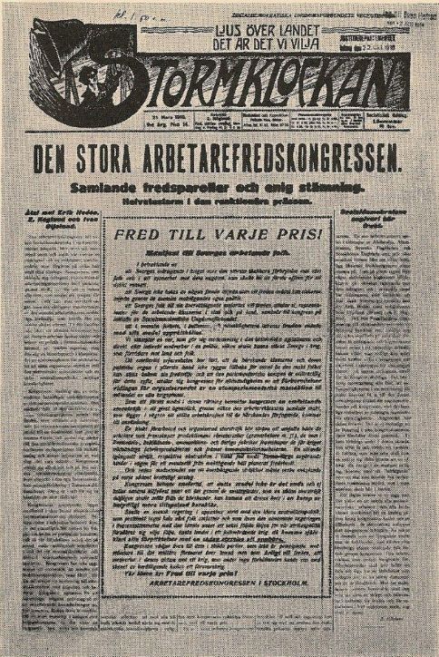 To this the Congress of the Union of Youth, which took place somewhat later, toward the end of 1914, responded, on one hand, by renewed attempts to obtain the recognition of the Union’s complete independence, and on the other, by a sharp protest against the transformation of Social Democracy into a bourgeois party and the petty barter conducted with the bourgeoisie by a majority of the Party’s parliamentary group. The attempt made in 1915 to draw Sweden into the world war on the side of Germany met with the firm resistance on the part of the peaceably-inclined working class. (The Party did not use all its power to fight the criminal game of speculating with the war, but the “Alarm Bell” took advantage of the opportunity, in the summer of 1915, to show what zealous pro-Germans were some of the more conspicuous “comrades” of the “right” wing, who openly invited recruits to the so-called “activist” clique which “agitated” in favour of Sweden’s coming out boldly for defense of the Fatherland—of the Kaiser and Krupp.