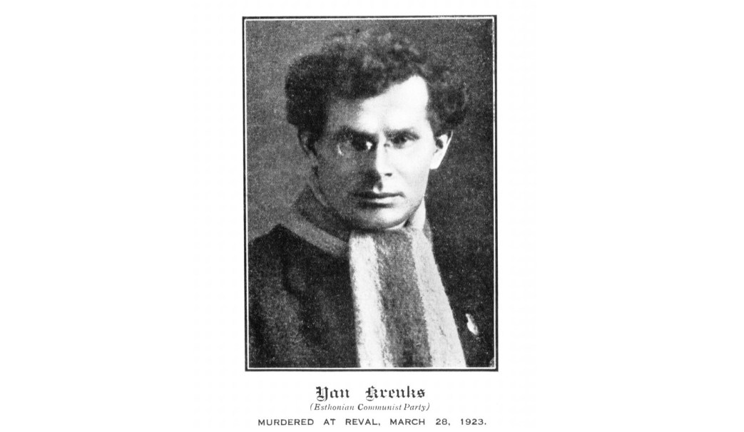 On March 28, 1923, in a street in Reval, a hired assassin laid low our comrade Yan Kreuks, a prominent leader of the Esthonian workers, an underground worker and member of the Central Committee of the Communist Party and of the Central Committee of the Young Communist League of Esthonia.