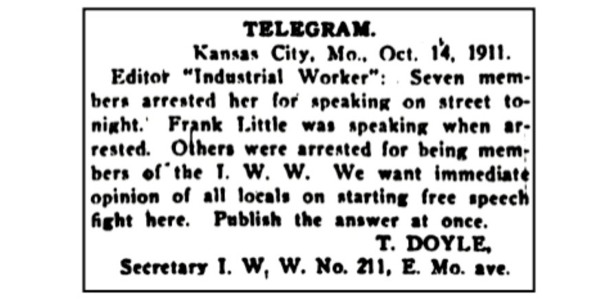 This means that the I.W.W. can speak on any corner in Kansas City, without securing a permit of any kind, where such meetings will not endanger the life and limb of passersby and where no valid objections are raised by abutting property owners. It means the I.W.W. has succeeded in maintaining the right of free speech in Kansas City and has parsed one milestone on the road to industrial freedom. Kansas City has been put on the map, along with Missoula, Spokane, Fresno. Superior and Philadelphia.