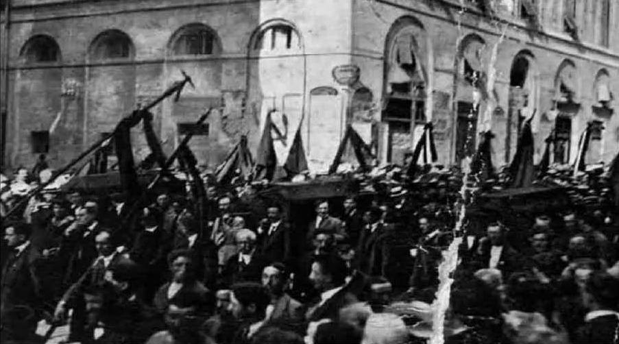 To stop the people who were leaving a meeting-hall from going to the central square to demonstrate, the gendarmes fired on the unarmed crowd, killing three workers, and wounding twenty more. After this massacre, the gendarmes, frightened, rushed to the barracks for shelter, and the people were left masters of the town. Without anybody even mentioning the word, a General Strike was soon complete, and the workers collected at the Trades Council to hold a meeting.