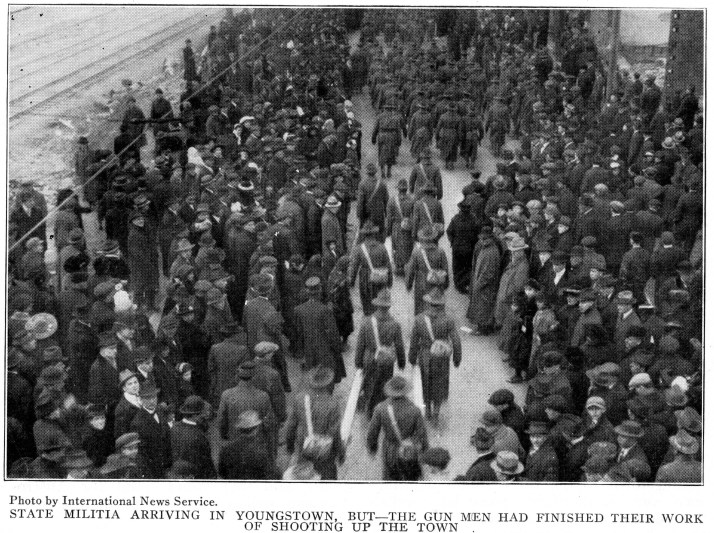 2. The Youngstown sheet and tube mills had refused to match the 10 per cent wage raise announced for all the United States Steel Company mills and a clash between imported gunmen and strikers spread till there was a city-wide insurrection. This theory that the initiative of the violence came from the strikers doesn’t stand up well in view of the fact that all the dead and most of the wounded are strikers and workingmen, while so far no gunmen and private detectives are known to have met death or injury.