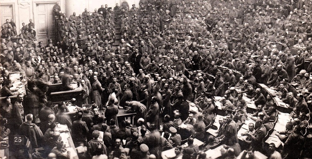 Then came the elemental mass action of the workers of Petrograd–mass strikes, demonstrations, food riots, revolutionary action against Czarism, that annihilated the reactionary regime mercilessly and completely, and which was the signal for the revolt of the soldiers, who were still agonizing in a hopeless, reactionary war. The bourgeoisie did not participate in this revolutionary action; their attitude was comprised in intrigues to depose Czar Nicholas in favor of a Grand Duke who would bring victory and recognize bourgeois requirements, in participation in the plots of Anglo-French capital directed against Czar Nicholas and a separate peace. It was the proletarian masses that marched to the assault against Czarism, that through the Workmen’s and Soldiers’ Council issued a call for the Republic and a call to the belligerent proletariat to act against Imperialism and the war.1 The bourgeoisie wanted a “constitutional monarchy”: this was admitted by M. Milyukov, the Constitutional Democratic leader, on March 13, after the revolution. It was the revolutionary action of the masses that gave the Duma courage to disobey the Czar’s ukase to dissolve; and it was the Workmen’s Council that imposed a republican program upon the first Provisional Government organized out of the old Duma opposition.