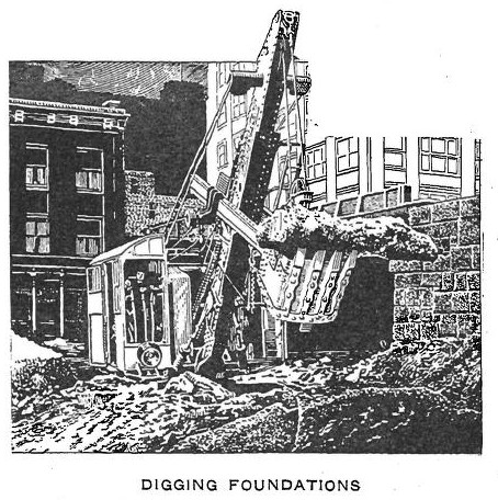 The erection of the Waldorf Astoria Hotel in New York in 1897 marked a definite change in building construction. While steel had been used before, (the Tower Building, New York, 1889; the Masonic Temple, Chicago, 1890, etc.) the building of this first sky scraper in the world with steel frame and elevator marked a new epoch in building. The introduction of the steel skeleton as the sole support for a building, replacing masonry, lumber and brick as the basic material, had a far-reaching effect, not only in building construction but upon the workers in the industry. In building construction it meant the elimination of the heavy wall base, the elimination of supporting walls, a reduction in building costs, the raising of the sky line to a limit which has not yet been reached. In other words, the introduction of steel as a basic material in building construction was the foundation upon which has been built in a very few years the highly centralized mechanized industry. Without the steel skeleton, and later reinforced concrete, without the pneumatic caisson process for the sinking of piers to great depths, the modern skyscrapers would be impossible.
