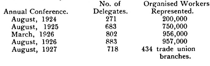 The following table shows the growth of the movement as expressed in the number of delegates attending the various annual conferences held since its formation and the number of organised workers represented:
