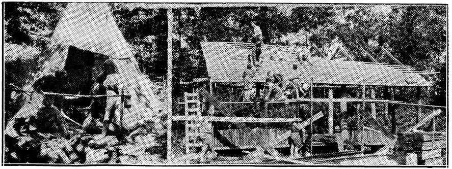In the shop are tools and materials for many kinds of work. Airplanes and boats are made as are also primitive musical instruments such as tom toms, and cigar box violins. Arts and crafts activities are closely related to camp needs. A tree house in an old maple, an Indian tepee, a lean-to for overnight hikes, and a large rough hewn open log cabin built by the 1ntermediate boys were among the construction jobs done last summer.