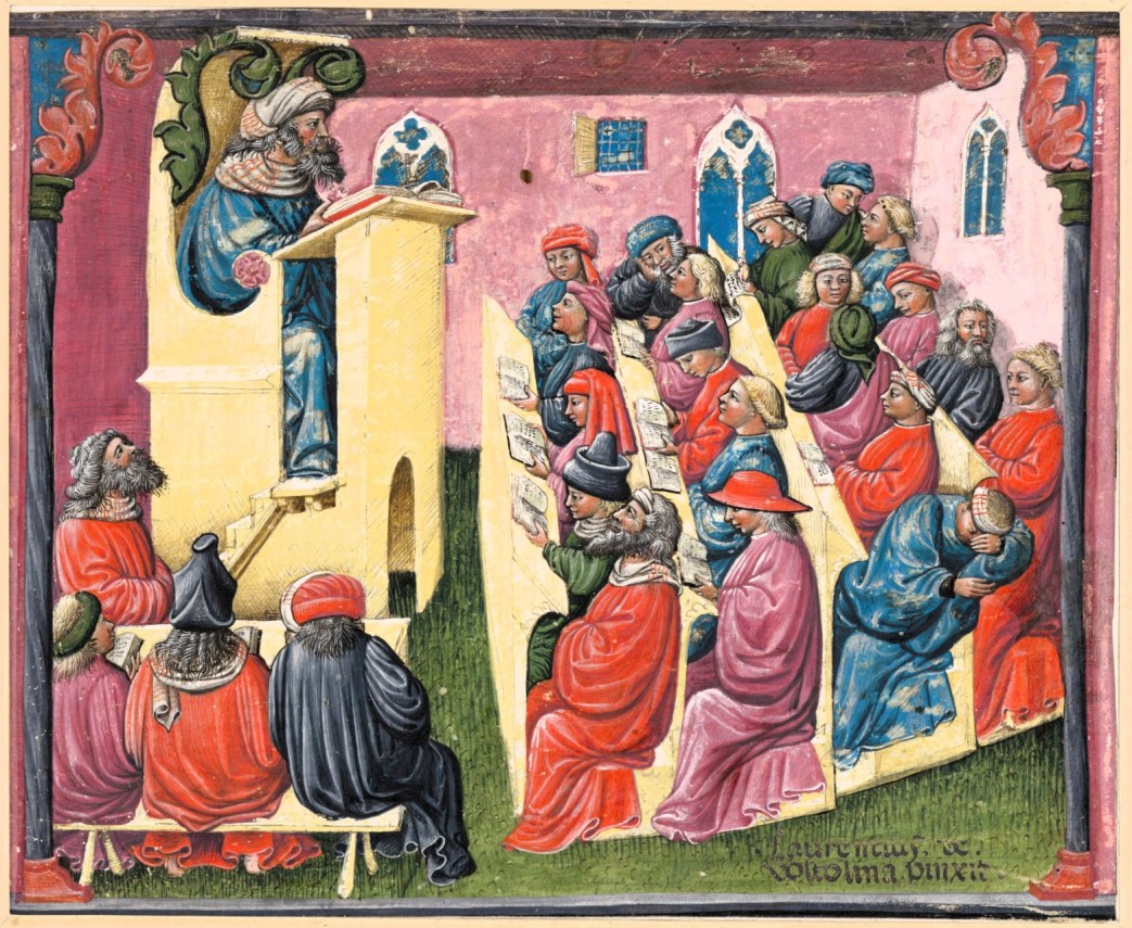 All of this sounds like a veritable paradise of students’ rights and privileges. Ardent modern libertarians, insufficiently informed concerning the background of these cessationes, might be tempted to sigh for a return to a lost age when students and faculties were all-powerful guilds, able to combat outside interference thus effectively. But historical analogy is a double-edged weapon. It must be remembered that medieval universities enjoyed their powers and immunities because they were closely connected with the Church, and because many of the clerks constituting the student body were primarily interested in canon law. When the Pope confirmed the right of cessatio, he was really protecting ecclesiastical interests. The University of Toulouse was founded expressly to combat any survivals of the Albigensian heresy, and none of the protests and quarrels of the scholars was connected with the support of unorthodox doctrine. In fact, one migration from Bologna is said to have been caused by “fear of something new”—timore novitatis—a reason which certainly would not please a modern libertarian. To be sure, it is reported that forbidden books were sometimes read at the University of Paris. One of these, by Guillaume de St.-Armour, had a title which sounds quite contemporary to our ears: “A brief pamphlet concerning the Perils of these Modern Times.” Nevertheless it is not recorded that either the Church or the universities were particularly hospitable to dissident opinion, nor was “academic freedom” an ideal within their ken.