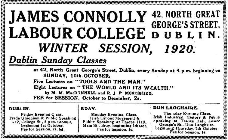The college has already begun its definitely educational work in Dublin, and has sought to awaken interest in the country by offering to trades councils and trade union branches its aid in setting up educational classes in their districts, supplying tutors, lecture outlines and special lectures.