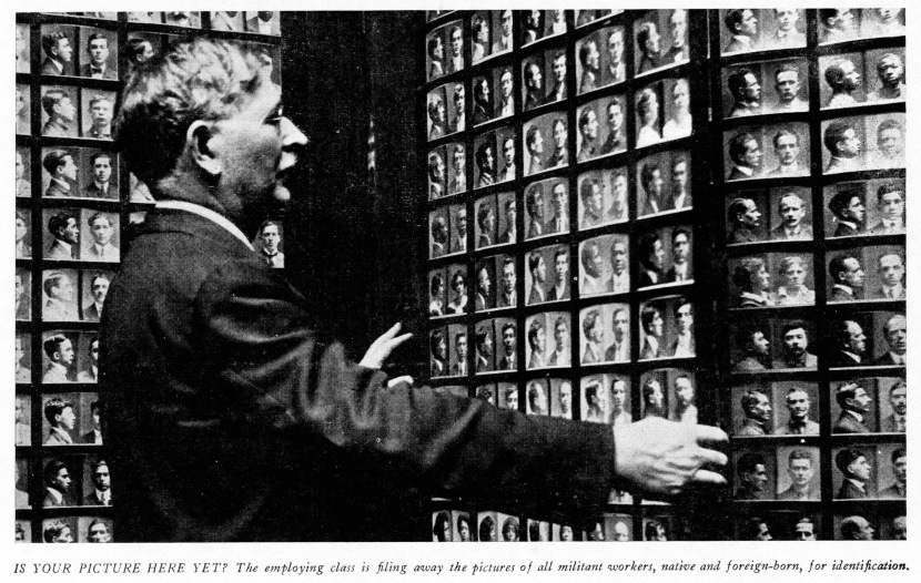 Already large lumber concerns of the Northwest have perfected elaborate check-up systems on militant workers. Directly imitating the police, with their Rogue’s Gallery, the employing class is keeping perfected Bertillon records for a Militant Workers Gallery. This is spreading over the country. Finger-printing of all workers–equally with criminals, is the aim of the bosses. Will the workers stand for this?
