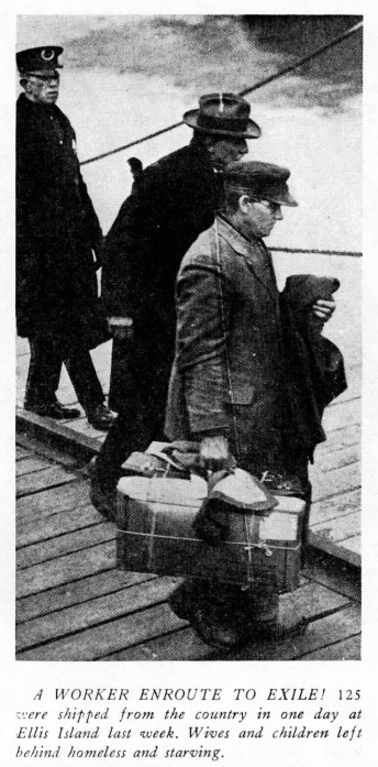 The whole wave of deportations is obviously part of the program. The Negro and foreign-born workers are in a peculiarly exposed position. So the Negro is lynched and meanwhile the masses of white workers are deluged with the propaganda of race prejudice. Likewise the foreign-born workers are harried and terrorized. The terror begins with individuals, and is worse in the inland industrial centers. All the deportations, the terrorizing of the foreign born, are part of the encirclement of the whole militant labor movement, leading to more ruthless wage- cutting and speed-up of the entire working class. They think this will be easier if the large section of foreign-born is cowed, silenced.