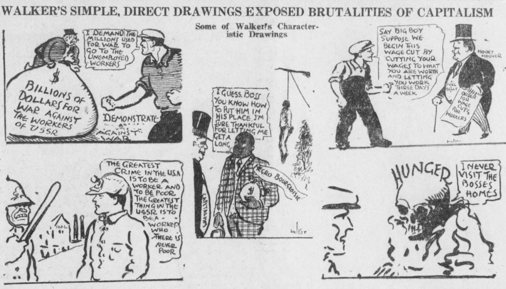 In the autumn of 1930, after several years of isolation from the revolutionary movement, Walker joined the Communist Party of the United States. Several months previously he had already come to the Daily Worker as one of its staff artists. With characteristic fervor and enthusiasm, he threw himself into his work, creating the new character “Bill Worker” which became known to thousands of miners, farmers and workers in the shops and mills.