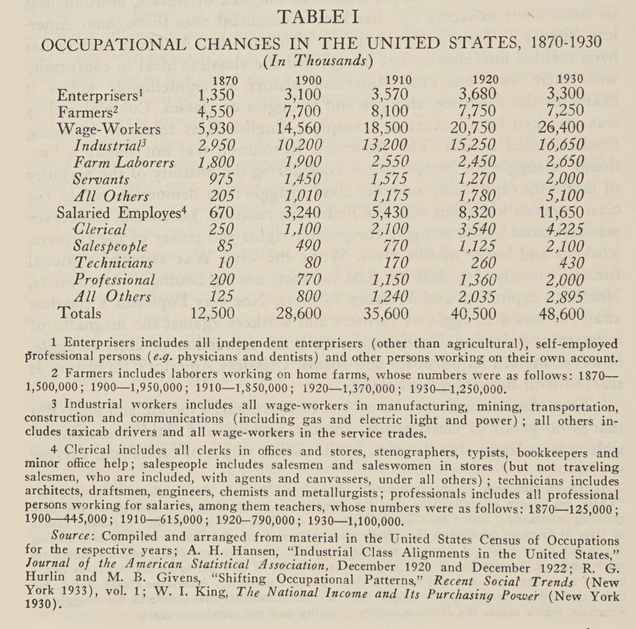 Since the ideal of the “classless” America of the 1820’s-30’s was ownership of independent productive property, it is significant that independent enterprisers today, including farmers, are only 21% of the gainfully occupied, compared with 85% a century ago. The change appears most strikingly in the case of business and professional enterprisers, whose numbers by 1930, despite the increase of industrial activity, were smaller than in 1910.3