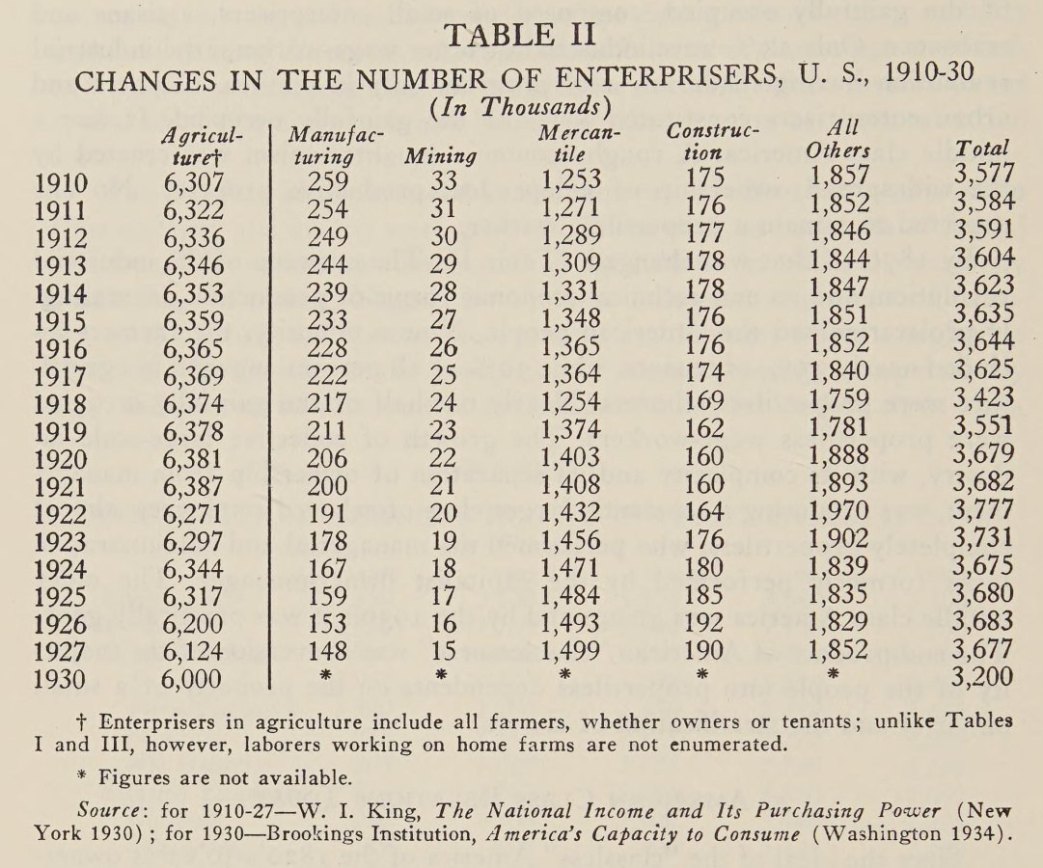 “While the absolute numbers of gainfully occupied, and also the absolute numbers working as employes, have grown steadily larger, the number of entrepreneurs has remained practically constant throughout the two decades [1910-27]…It obviously follows that the percentage of the population classed as entrepreneurs has diminished…It [is] perfectly plain that the independent entrepreneur is playing a relatively much less important role in industry than was the case a score of years ago.”4