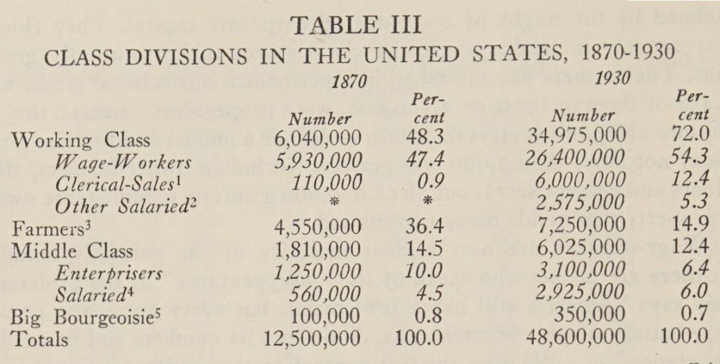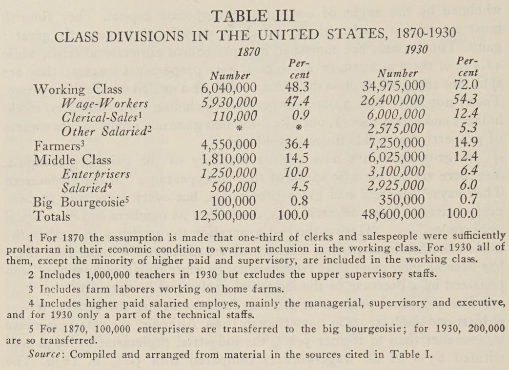 “Already the middle class in America, not including the farmers, outnumbers the working class. Adding farmers to the middle class, the majority in sheer numbers is large.”…“If half the white collar workers be transferred from the proletariat to the middle class and also a fourth of other skilled workers, the middle class would surpass the proletariat. This is a modest estimate of the proportions of these two groups that might be expected to respond to appeals directed to middle class consciousness rather than to appeals directed to the self-consciousness of the proletariat.”…“If the middle classes are taken to include the farmers, professional workers, ‘petty bourgeoisie’ in the strict sense, and white collar workers, the middle classes are at least equal to the working class.”10
