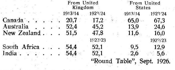 The process of the rise of the economic and political position of the Dominions within the Empire finds its counterpart in increasing economic dependence upon the United States, and the following table shows the imports from the United States and the United Kingdom, compared in percentages: