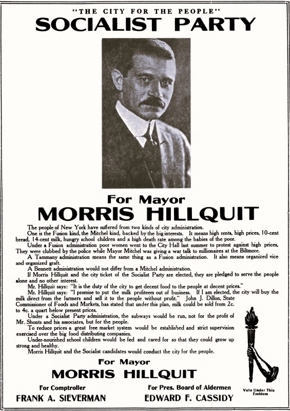 By far, the best showing of the Socialist Party in a New York City mayoral race was Morris Hilquitt’s 1917 run, gaining over 21% of the vote and nearly coming in second. The Socialist Party had split that April over the war, with the pro-war Right asserting that the Party would isolate itself with its militant anti-war position. To the contrary, the Party gained massively, in both new members and votes, after it turned to the Left as the war approached. Below is an illuminating analysis and context of the race from leading Left Winger, New York Volks-Zeitung’s editor, Ludwig Lore.