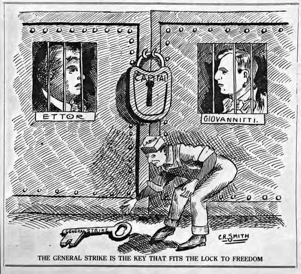 The arrest of these two fellow workers was a desperate effort on the part of the mill owners to break the spirit of the men, women and children involved in the strike. It was hoped that the arrest of Ettor and Giovanitti would create confusion that would result in a stampede back to the mills upon the mill owners terms. Failing to secure this result, the authorities of Essex County have been forced to make an attempt to secure a conviction in order that they may justify the arrest and continued imprisonment of Fellow Workers Ettor and Giovanitti.