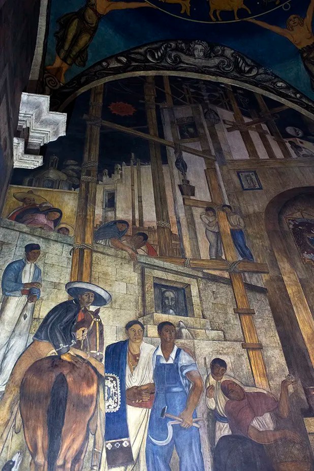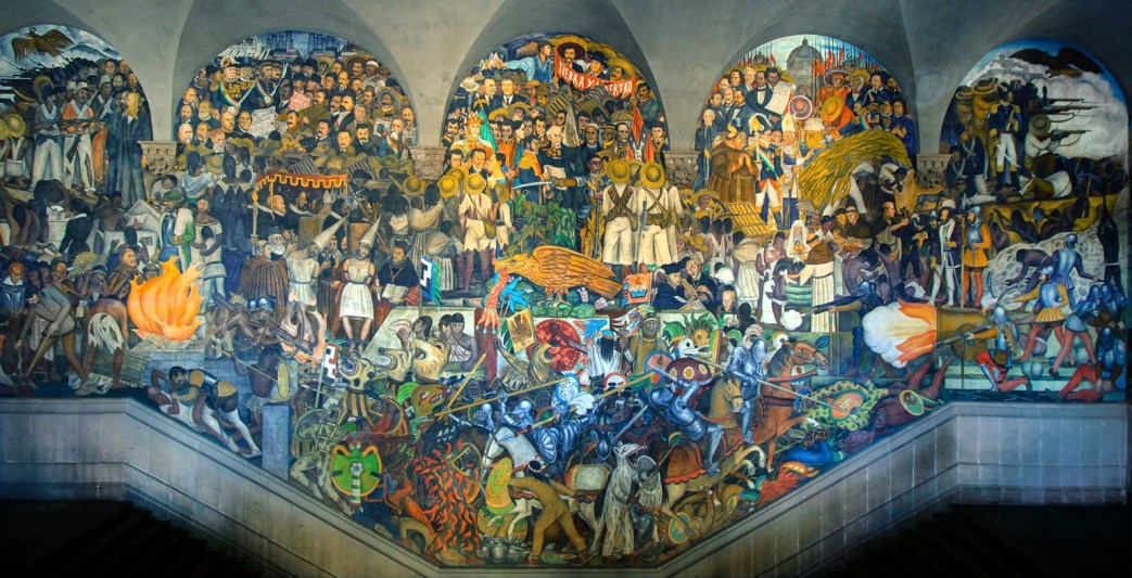 Going to see the paintings of Diego Rivera in the courts of the Secretaria of public education straightens you out a little bit. They give a dramatic sequence to all this brightness and white glitter, to the terribly silent welling up of life everywhere. In tense earth colors that have a dull burnish to them he has drawn the bending of bodies at work, the hunch of the shoulders under picks and shovels of men going down into a mine, the strain and heave of a black body bent under a block of marble, men working at looms, in dye-vats, spooning out molten metal. Then there are the plodding dust-colored soldiers of the revolution, red flags and black flags of the Zapatistas, crowds in marketplaces, women hanging out washing, politicians making speeches, Indians dancing. Everywhere the symbol of the hammer and sickle. Some of it’s pretty hasty, some of it’s garlanded tropical bombast, but by God, it’s painting.