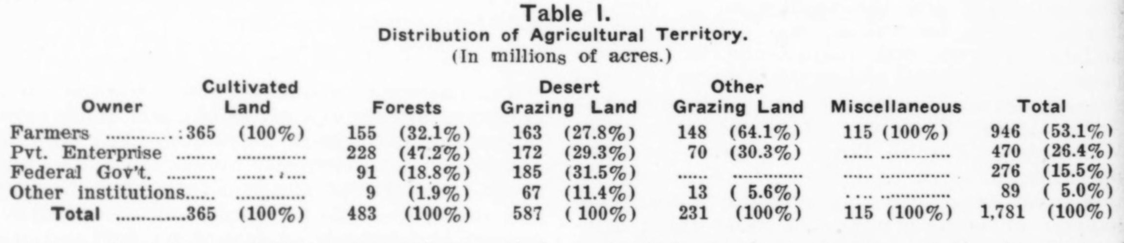 In 1919 this 1,781 million acres belonged to the following categories—farmers, private non-farming enterprises, federal government institutions, other state and social institutions—in the proportions shown in Table I.