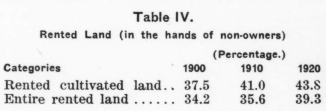 What do these figures show? They show that between 1910 and 1920 it became particularly difficult for the tenant to rise on the agricultural “ladder,” that he was more and more compelled to fall back on share tenancy, that he became more and more dependent on the owner, developing into nothing more than an official of his, in the best of cases—his partner. A large part of this was the result of the war-time high prices of agricultural machinery, but even more was this a result of the war time growth in land prices which forced up rent to a higher degree.
