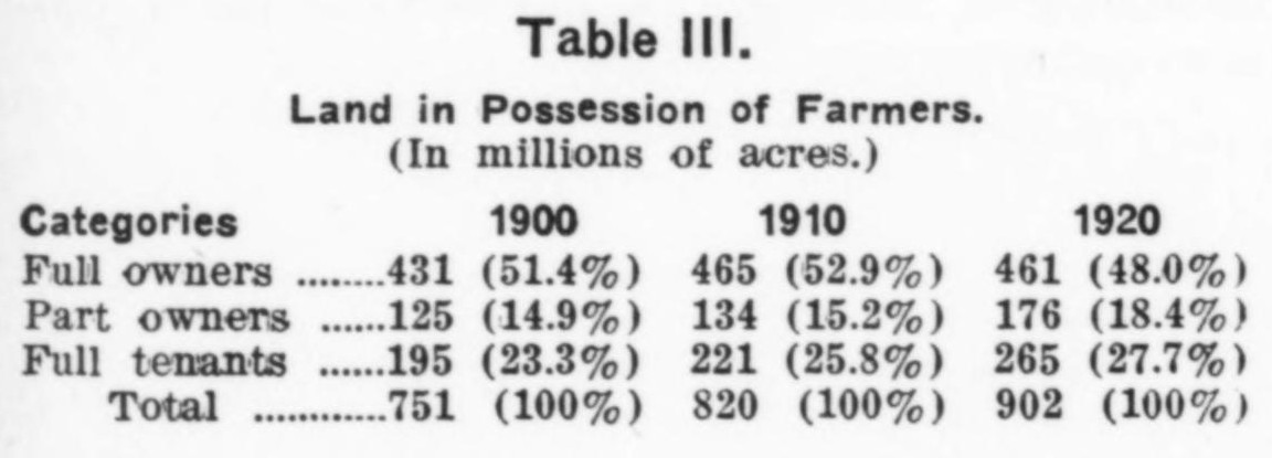 From the figures it appears that the possession of the full owners grew very slowly (indeed between 1910 and 1920 there was a diminution of 4,000,000 acres). At the same time, however, the lands of the part owners and tenants grew continually and quickly—for the first category an increase of 42,000,000 acres, for the second of 44,000,000 acres for the period between 1910 and 1920. This increase was not at the expense of the land formerly operated by full owners but took place through expansion to lands hitherto uncultivated. In other words, the entire increase in cultivated land in the ten years went to part owners and full tenants.