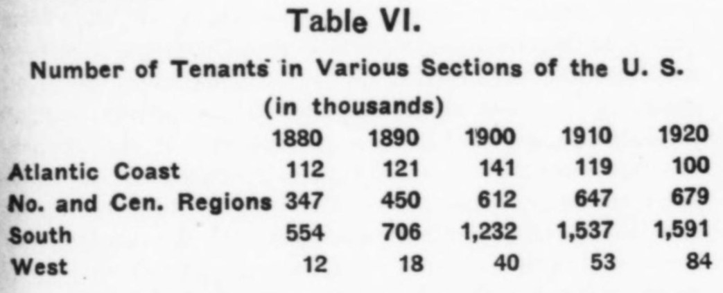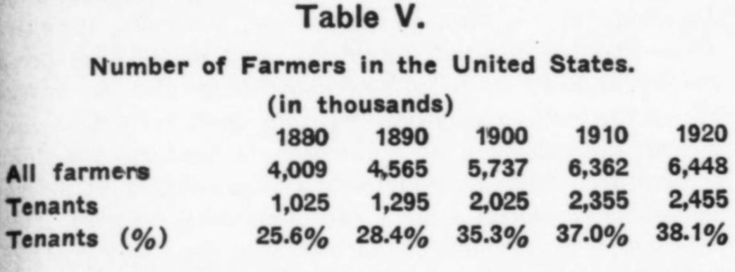 But we must not fail to examine the other side of the picture. First, according to the 1920 census, 42% of the owners had never been either tenants or farm hands. Secondly, according to the same census, 47% of the tenants became tenants immediately and did not pass thru the stage of farm hands. Even, therefore, according to the 1920 figures, “climbing the ladder” was not a common phenomenon.