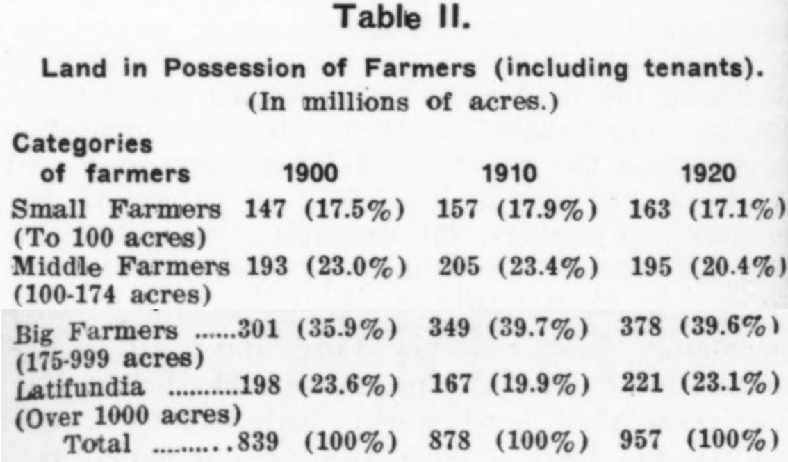 1. In 1920 the great estates made up 63% (39.6% plus 23.1%) of the entire agricultural territory. Surely these enormous farms were not built up on the “labor-principle.” Moreover, it must be remembered that among the smaller farms (less than 175 acres) there are many capitalist enterprises (dairy farms, vegetable farms, orchards, etc.)