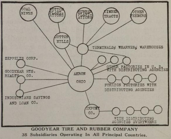 The ramifications of the rubber trust extend far beyond Akron. Only part of its business is located there. Firestone holds a 99-year lease on a million acres of former jungle land in Liberia, Africa; 200,000 acres of this land were planted to rubber trees in 1910. The remainder is being cleared and planted. Firestone has plants at Akron; Hudson, Massachusetts, and at Hamilton, Canada. He has preparation mills at Fall River Mass., and at Singapore. Goodyear has extensive rubber plantation holdings in Sumatra; controls various companies producing cotton and cotton fabrics, including the Devon Mills at New Bedford, Massachusetts; the Goodyear Cotton Mills at Goodyear Con.; the Goodyear Clearwater Mills at Cedartown, Georgia; the Goodyear Cotton Company of Canada, and the Goodyear Textile Mills Co. of Los Angeles, California, all engaged in manufacturing tire fabric, and the Southwest Cotton Company located at Phoenix, Arizona, which owns 35,767, acres of land and is engaged in the growing of cotton. Goodyear products are distributed through a distributing organization with branches in the principal cities of the world.
