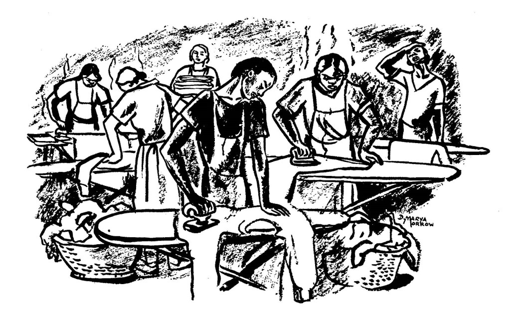 Thousands of women are employed in the laundry industry. A great number are married women both Negro and white. These women helped to build up the laundry industry, an industry which is today worth millions of dollars, work under the most miserable conditions, under a vicious speed-up in places of excessive heat, especially in the summer months. Very often the workers faint at their mangals and iron. And all this for a miserable wage of twelve dollars a week for fifty and more hours. But they seldom make a full week, although they are forced to spend most of the time in the shops. They only get paid for the hours they are working, which sometimes means only a few hours a day and the rest of the time is spent in waiting for work.