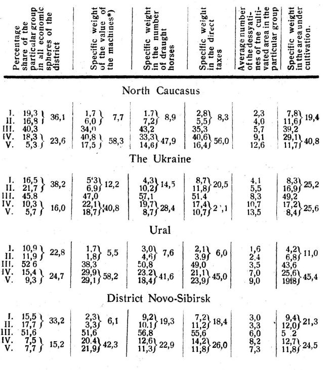 This process of equalisation continued until about 1922. Under the New Economic Policy the process of differentiation set in again. The appended data were compiled by the Communist Academy and the Central Control Commission from the state finance accounts for 1924/25. They show clearly the classification of the peasant farms in social groups. These data refer to those agricultural districts in social groups. These data refer to those agricultural districts playing a decisive role both in providing the towns with grain and furnishing supplies for export.