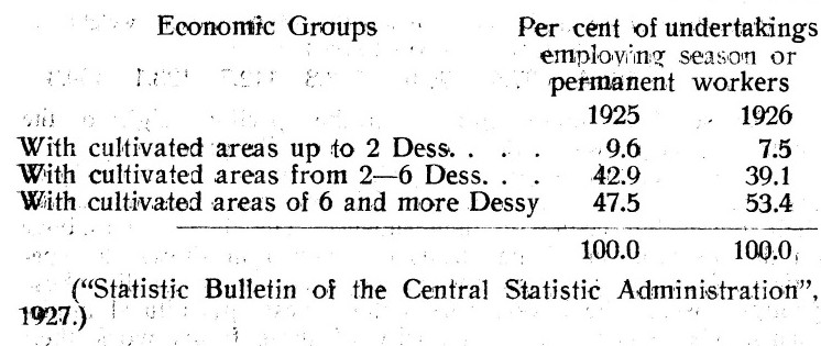 That a certain degree of progress may be recorded for the groups with small areas of cultivated land does not prove their increasing economic independence. The data given above on the distribution of the means of production shows the specific weight of these groups to be exceedingly small. These groups possess the fewest horses the fewest agricultural implements. The overwhelming majority of these farms work their land with the aid of hired cattle and machines. This is the group which Lenin named agricultural labourers with a holding of land.
