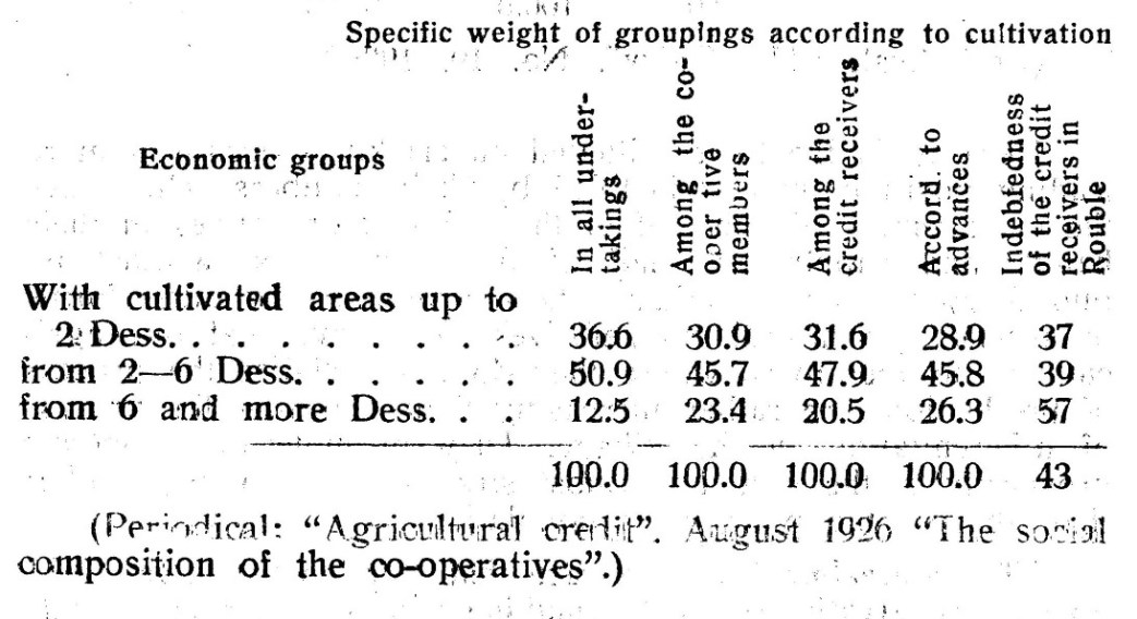 The data available at the present time on the spread of co-operation among the various social strata of the village show, however, a comparatively large participation of the well-to-do strata of the village in the whole work of the co-operatives. Thus the statements issued on the agricultural credit co-operatives of the R.S.F.S.R., which comprise two thirds of the members of all agricultural co-operatives, give, the following picture: