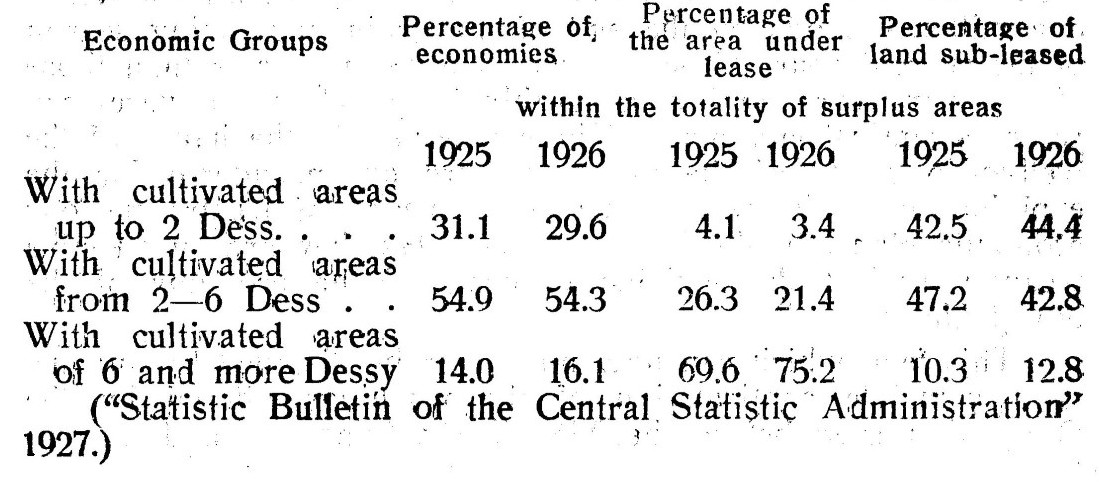 In 1925 a growth of the group without cultivated land could be recorded for the first time. The specific weight of the groups without cultivated land was shown by the spring enquiries of 1924 and 1925 to have increased from 2.1% to 2.8% in the areas not producing sufficient grain for their own needs, and in the areas producing a surplus from 4.8% to 5.1%. 1926 shows a growth of the groups without cultivated land all over the R.S.F.S.R.