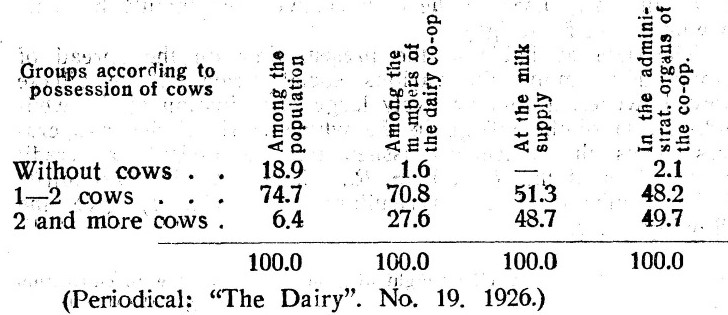 Here again the better situated undertakings occupy a more leading position than is justified by their numbers. They have the management of one half of the dairy co-operatives in their hands, and supply one half of the milk to be worked up into dairy products. Similar data are supplied by other forms of special agricultural. cooperatives. All prove that our agricultural co-operatives, where they do not socialise the process of production, are rather increasing than lessening the process of differentiation in the village. They promote the economic prosperity of the rich, uppermost stratum of the village rather than that of the poor rural population.
