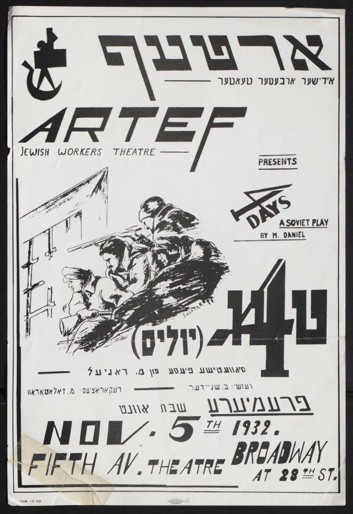 Begun in 1925 as a project of Young Workers League members, Artef (Arbeiter Theater Verband) grew into a central institution of radical culture during its 15-year existence. Combining political commitment with the highest artistic aspirations, the theater’s influence reached far beyond the Jewish left and was the training for a generation of actors, directors, and writers.