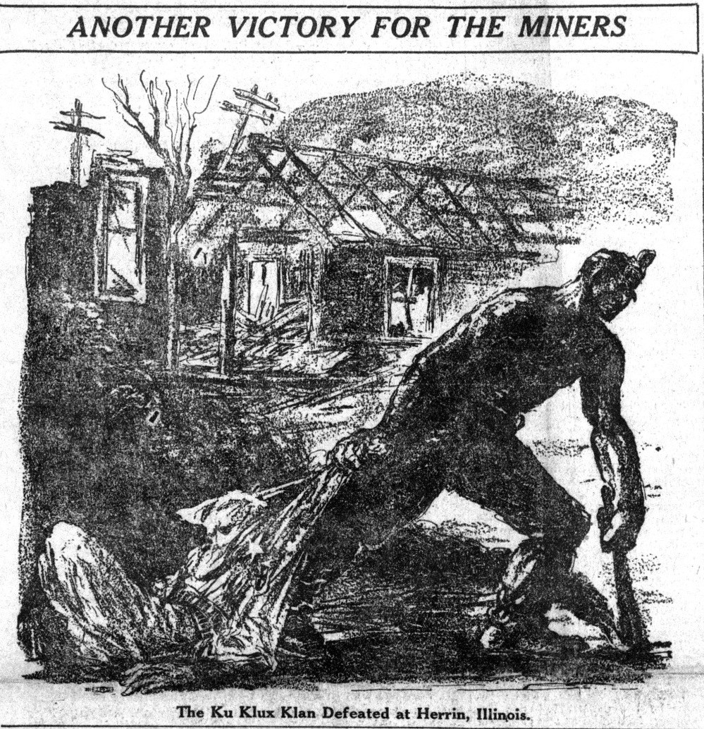 The K.K.K. had gathered from four southern counties, keagles, kowards and all, to make a raid to terrorize the Zeigler miners and frighten them back to work. But they got cold feet, and this morning only a few men tried to get into the mine. There are 18 men arrested so far upon the warrants issued charging “conspiracy to murder.” Among these are Henry Corbishley, deposed president of the Zeigler miners’ local and a foe of the Farrington-klan machine. Others include Corbishley’s two brothers and Matt Crjnoevich, a militant leader of the progressive miners of this camp. The bail is set at $200 each, and Corbishley and his brother miners are now released. Other warrants are yet not served.