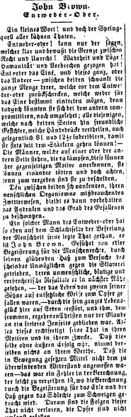 Such a man, in the person of John Brown, has just performed his last exploit on the battlefield of human emancipation. He was influenced by a noble enthusiasm for the rights of man, and by a thorough hatred of the specious attempt to perform impossibilities against slavery,–an attempt whose unmanly, bloody and criminal results he had witnessed in the closest proximity–to which the life of two of his sons had fallen a sacrifice in the most horrible manner–which had ruined all his happiness in life here on earth, and had left him, the pious, devoted Christian, only the belief in a freer world hereafter. All this vindicates his act in its motive and in its purpose. That it had no apparent result detracts nothing from its merit. That the means employed in the disturbance were not adapted to overcome opposition, was an error in calculation, which it is easy to forgive, when the calculation is induced by a generous enthusiasm, and by aversion to keep silent in regard to wickedness. The consequences of this act, therefore, are not lost; the victims have not fallen in vain.
