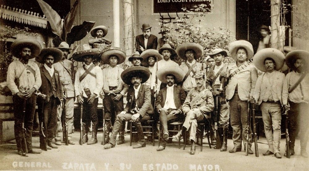 The sun is hot and white on the dust of the market, on the small square awnings in the blue shade of which the Indian women, heavy as granite idols, squat behind minute piles of peppers or oranges or onions. There’s a heavy smell of fat from the pork crackling that seethes in a huge cauldron in front of the cantina. From inside, on the sour cool rankness comes an old man’s voice singing to a guitar. He is singing a corrido called The Ghost of Zapata. People stop talking when they hear the name of the song. Brown faces, yellow faces, are motionless under huge pushed back straw hats. This is Morelos where Zapata ruled.