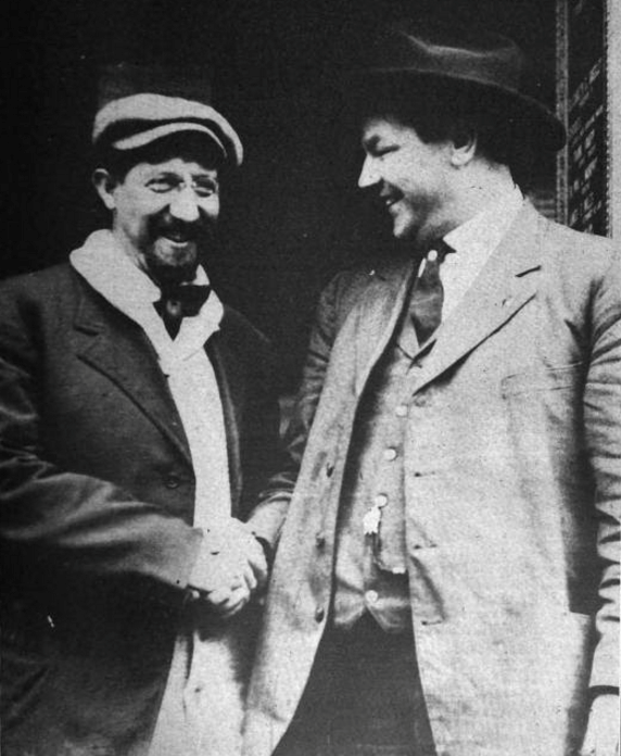 The meeting was called (July, 1912) to assemble at the Boston Commons. We invited strikers to come from Lawrence. I had promised them Bill, expecting that some 500 would follow the call. They came from Lawrence 4,000 strong: they were going to see their father, their friend, their general. “Go to see Bill” seems to have been the most captivating slogan of the day. We marched through the streets of Boston singing the Internationale in twenty- eight languages. A crowd of 60,000 met at the Commons. Under the wooden platform Big Bill was hiding. (This was my personal little ruse. Bill had not yet furnished bail and there was a standing order to the police to arrest him on sight.) There were speeches and singing; but when we announced the name of William Haywood and he climbed from his hiding place into broad daylight, a tremendous wave of enthusiasm surged over the huge gathering. There was no end to singing, shouting, waving of hats. The detectives rushed to seize Bill, but the Lawrence strikers formed a solid wall around him, keeping the invaders back. Bill was allowed to speak. When he finished he was seized by detectives. My Lawrence crowd (I was marshall of the parade) went marching to the railroad station under the red flag. No sooner had we arrived when we found Bill was waiting for us. He had in the meantime furnished bail and had been released. He had come to see his brood, his children. Never in my life have I witnessed men and women so frantic with joy, as those several thousand Lawrence strikers. No children ever greeted a beloved father with such an outburst of almost ecstatic elation. He made a little speech, a very brief one. Then he put his big arms around my shoulders. I, a young man, just beginning my career in the labor movement, thought this compensation enough for all my work. The general recognized the services of his lieutenant. The general was appreciative. On the following day the papers published a photograph of the scene, the caption reading, “Big Bill Haywood and his Lieutenant.”