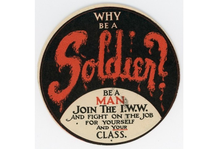 The mass produced, color sticker was an invention the I.W.W. made full use of. These ‘silent agitators’ were plastered along rail lines, by soup kitchens, in logging camps, skid rows, mines, restaurants, and mills from one end of the country to the other. As the U.S. increased its standing army and imperial footprint with invasions of Central America, the Caribbean, and Mexico in the early 1900s, the I.W.W. began an anti-militarist campaign inspired by the French sabots.