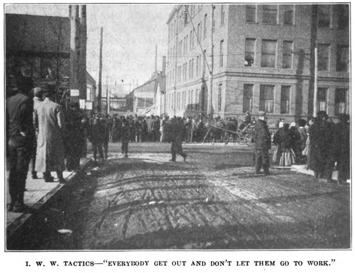 Two weeks of slow progress in organization, Chairman David Williams and Chief Organizer Jacob Tazlear, ably supported by their corps of assistants, worked night and day gathering the men into the unions, then Ettor and Schmit of the I.W.W. came to town. Their addresses on “Solidarity” aroused the fighting spirit of the men. Ettor advised the men to get up in the morning and do picket duty in a body. “Don’t let anyone go to work,” said he. When the leaders decided to act on this advice, sending more than 2,000 men on the picket line, the big plant closed down. Mass action cannot fail of success.
