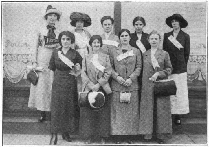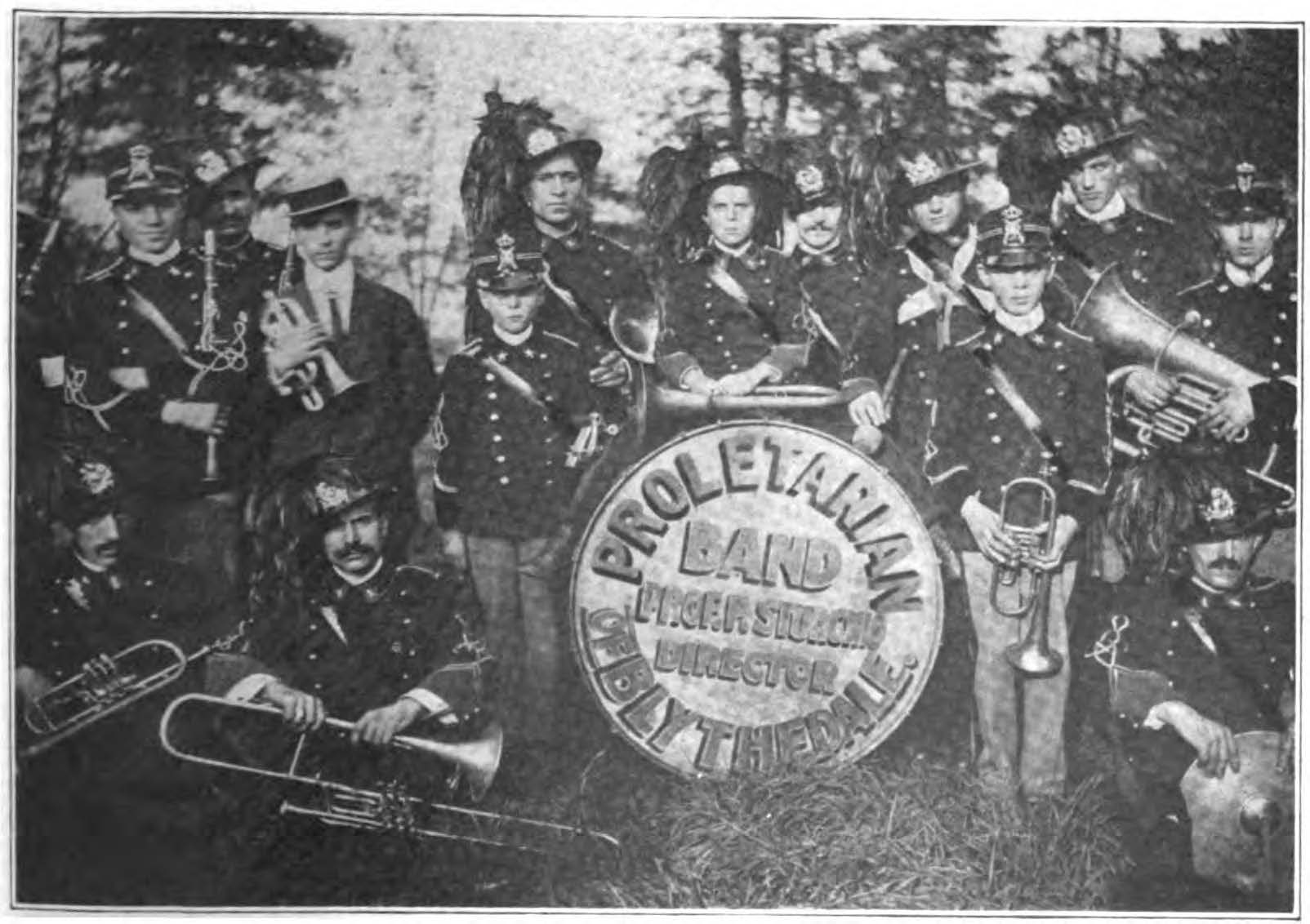Another moment and perhaps the most dramatic of all was when, while the mounted police thought they had guarded off a block of the street, suddenly there appeared in the middle of this block from an alley a Socialist band led by a slender girl, Elizabeth Hobe, who was waving a red flag as they marched right down through this square. It did not stop playing until the players were placed under arrest and taken to the depot. As the train pulled out the tenor drummer stood on the rear platform and drummed the Marseillaise in ridicule to the chagrin of the police.