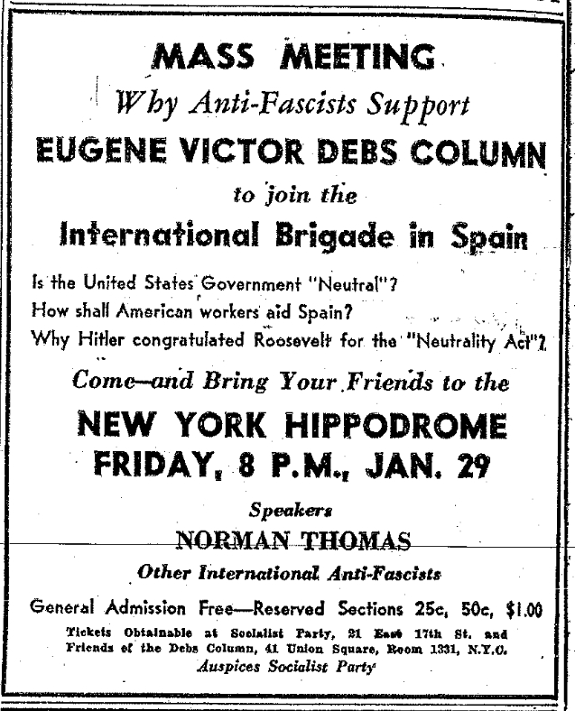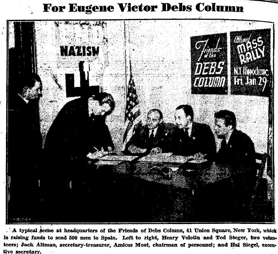 Amicus Most, of the S.P.’s Militant faction, defends the campaign to break the blockade and send people to fight fascism in Spain as the Eugene V. Debs Column. With both the political-military situation changing and the challenge of raising, equipping, and transporting hundreds of volunteers, illegally, to fight in Spain meant that the Debs Column never fully developed, dozens comrades were sent, most of whom would find themselves serving in the International Brigades, a number like Paul Niepold killed in the fight, others working behind the lines as nursing and support staff.