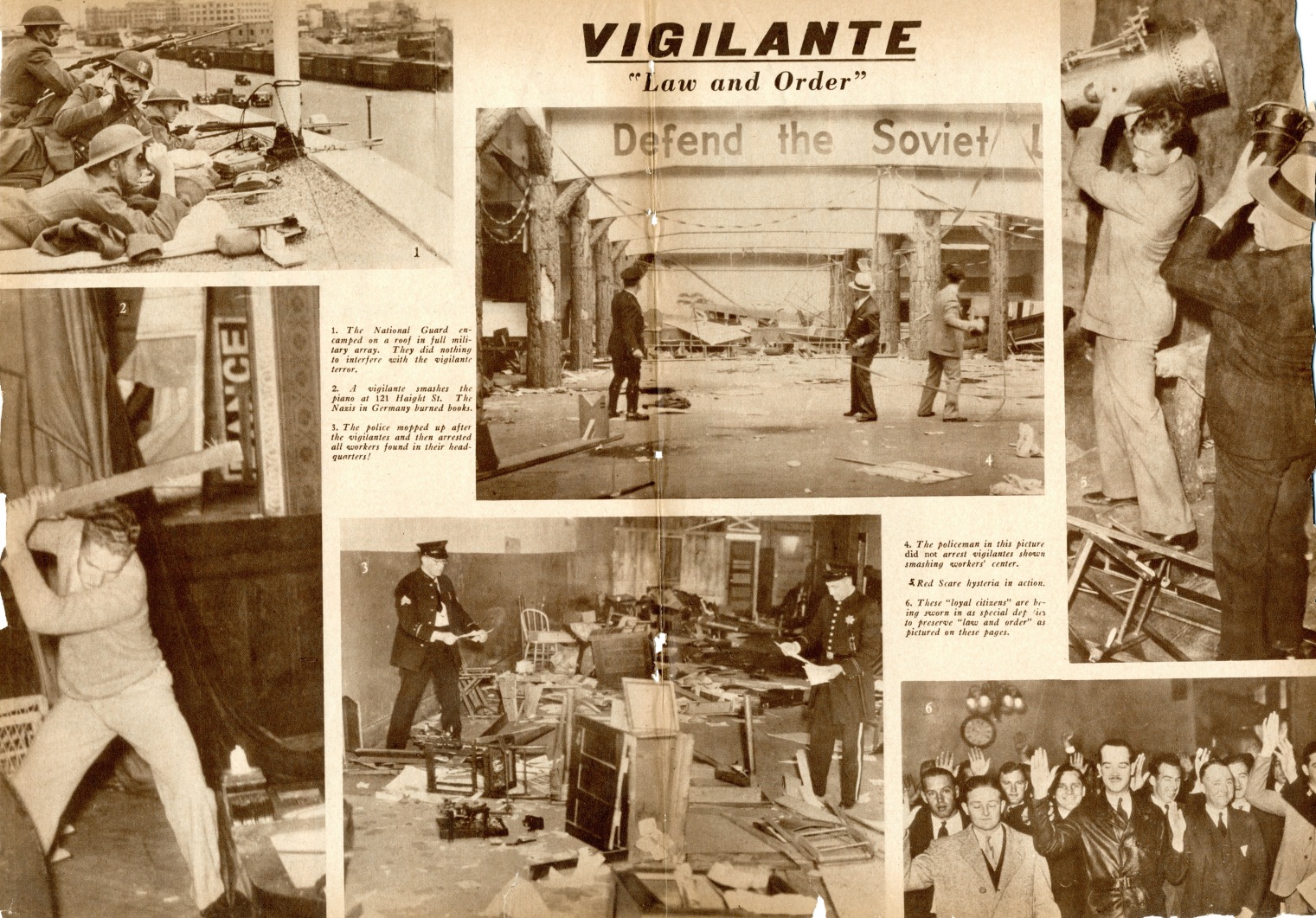 While the Party raised the slogan of organizing mass self-defense against attacks on workers’ meetings and headquarters, the raids caught the Party unprepared and no serious resistance could be organized against the fascist gangs, even when the headquarters of the Marine Workers Industrial Union and the International Longshoremen’s Association, the center for thousands of strike pickets, were raided. The slogan of mass self-defense against the terror must be translated into actual organization and put into action. Only the mobilization of the masses, Negro and whites, for the organization of workers’ self-defense groups based upon the factories, trade unions, and other mass organizations, can defeat the terror. A nationwide protest movement against these attacks must include A.F. of L. and Socialist workers, and every trade union local and Socialist Party local must be approached to join in united front action with the revolutionary workers.